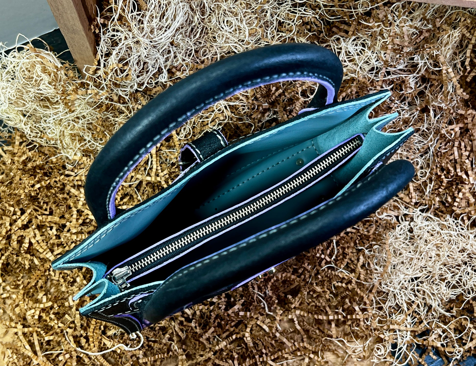 This beautiful handbag is completely handmade. All holes hand punched and all hand sewn together. The bag is 10" wide 9" tall 3 1/2" deep.