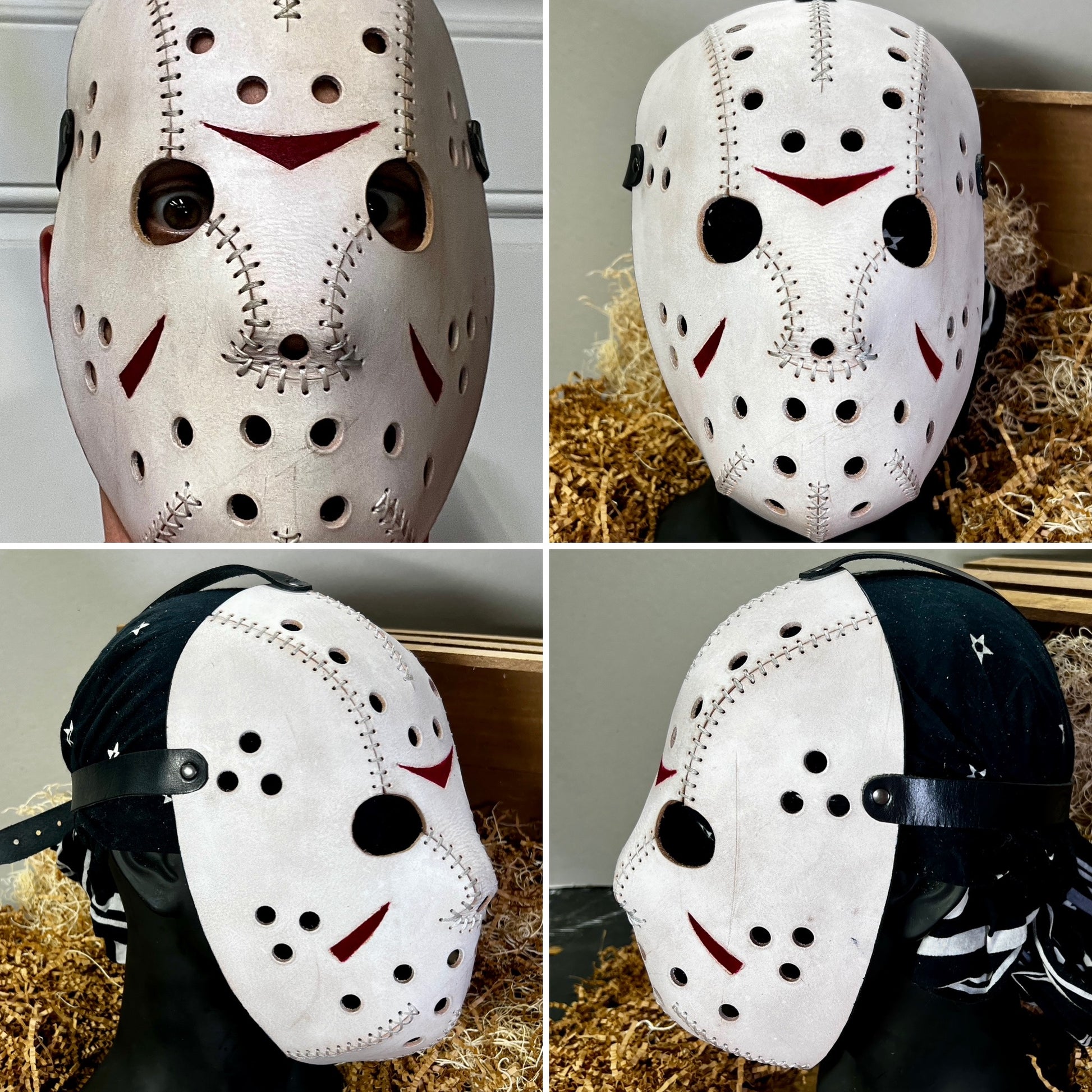 Leather hockey mask of a well known horror character. All handmade of leather and hand stitched together. The mask is 10" long