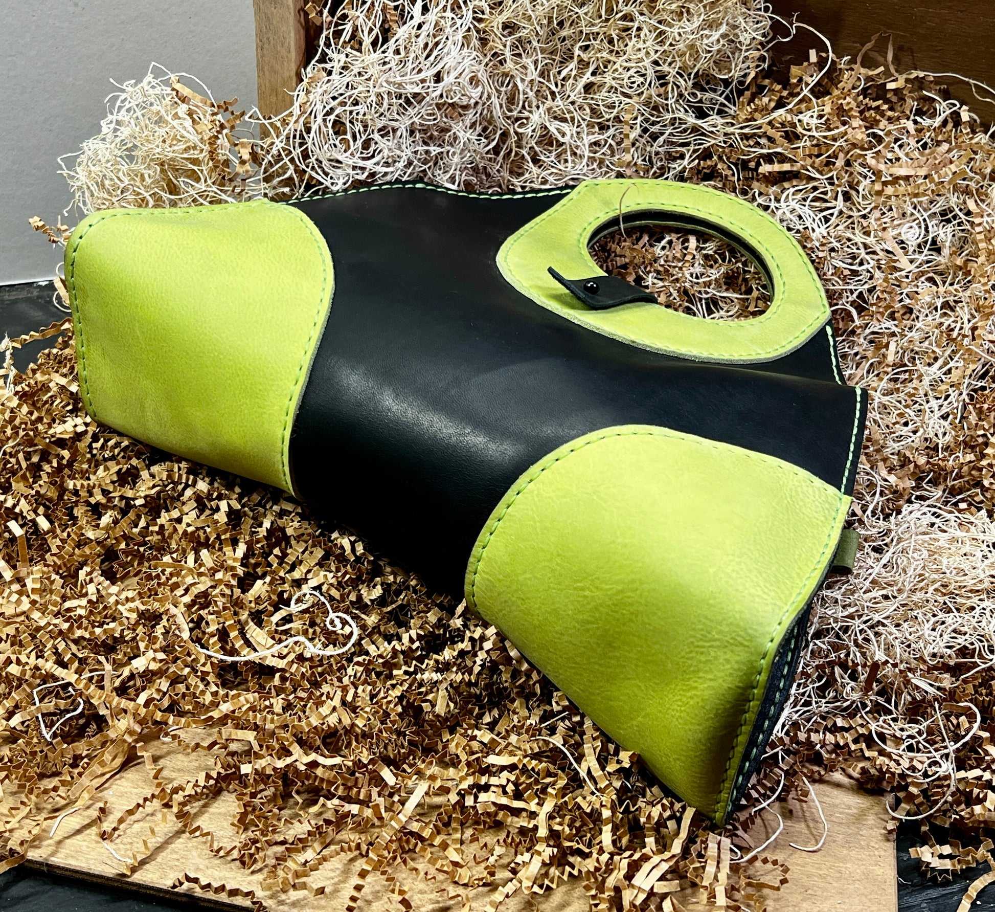 This handbag was inspired by the game Marathon and is completely handmade. All holes hand punched and all hand sewn together. The bag is 12 1/2" wide 11" tall 4" deep.