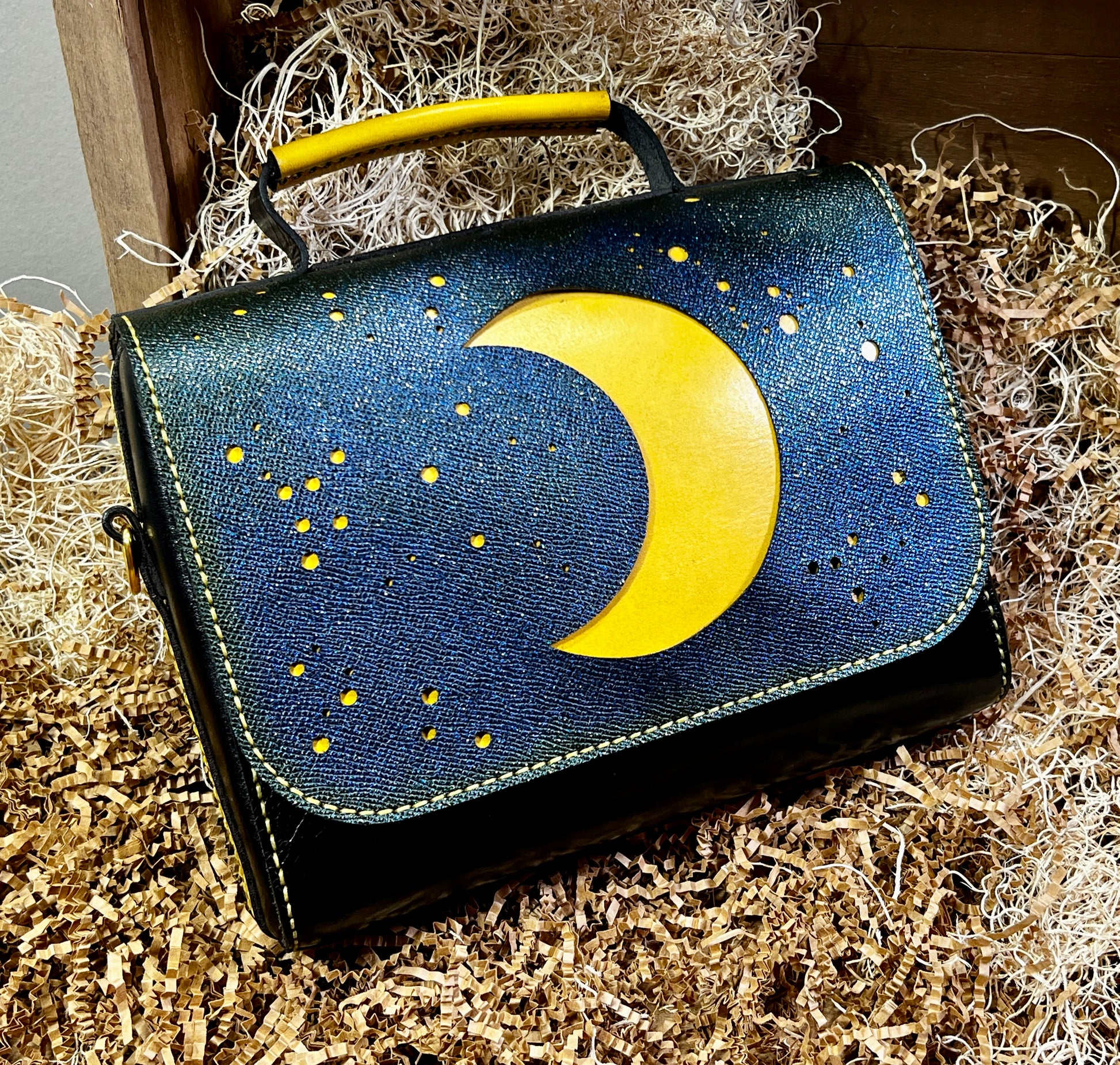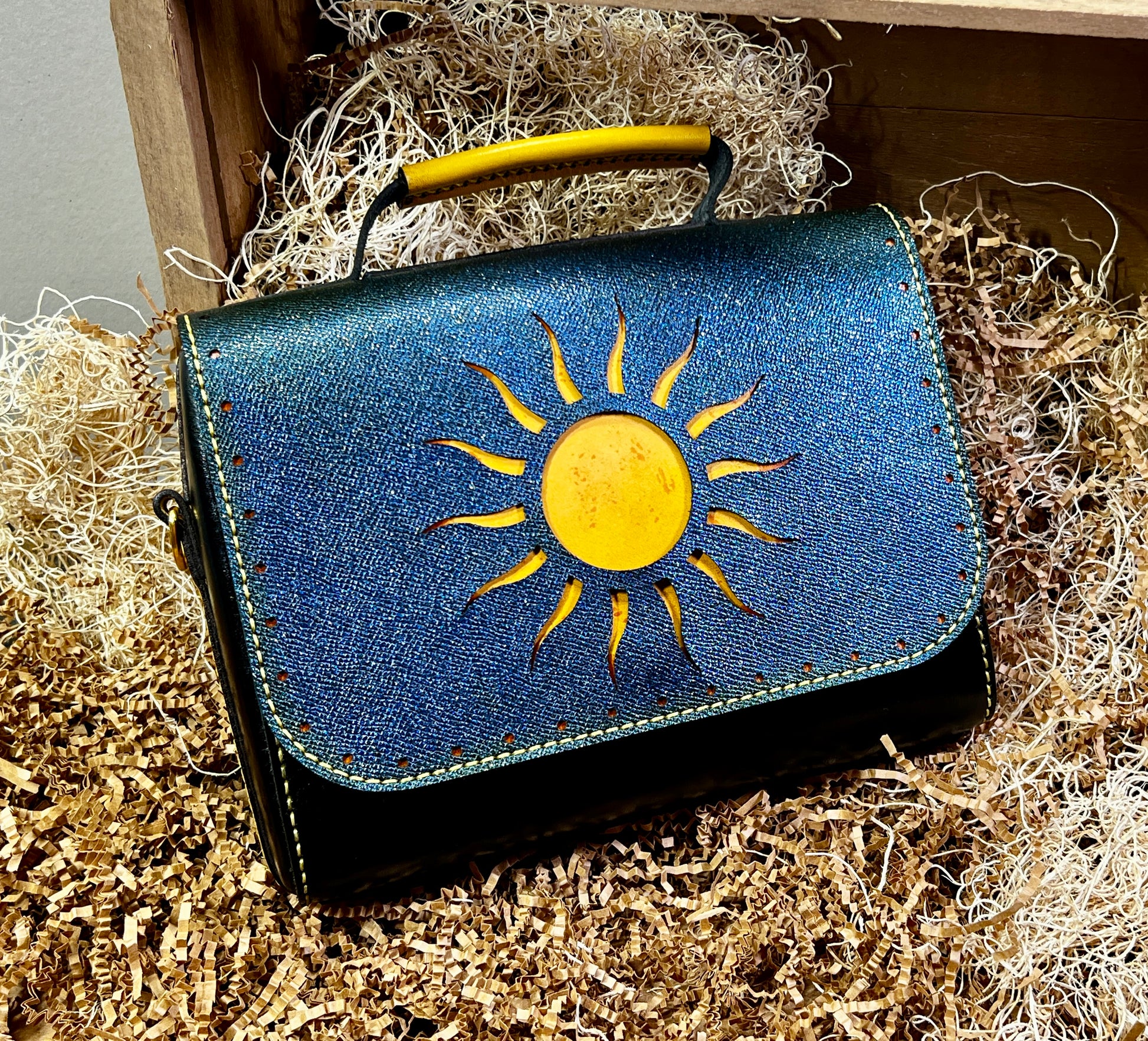 This beautiful handbag features the sun on one side and the moon and stars on the other. Flap on either side can open. All holes hand punched and all hand sewn together. The bag is 10" wide 8" tall 2 1/2" deep. Does have rings on sides to add a strap if desired.